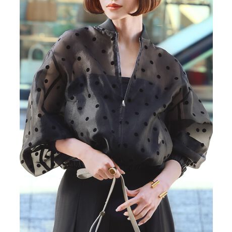 ハリのあるオーガンジーにフロッキーでドットをプリントした、今季のトレンド感満載のブルゾンです。