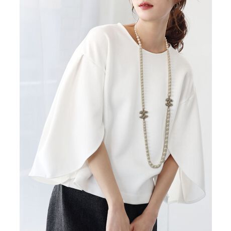 裾すぼまりのチューリップ袖が特徴のトップス。