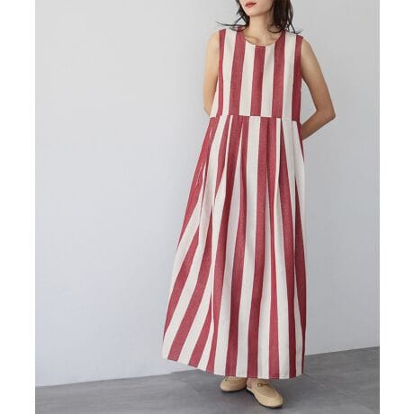 大胆なストライプ柄が目を惹くノースリーブワンピース。