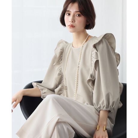 シンプルなシルエットにボリューム感があるフリルがポイントのトップス。