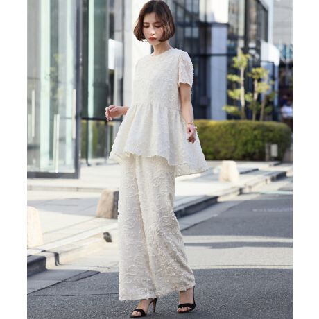 繊細なジャガード素材を使用したペプラムトップスとセミワイドパンツ。