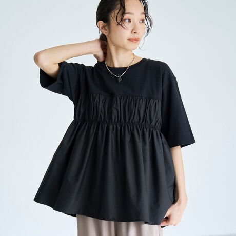 カットソーに布帛素材をドッキングした、立体感のあるギャザーデザイン。