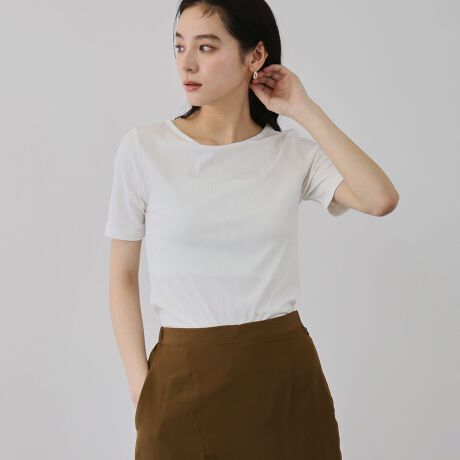 カジュアル見えしやすいテレコ素材も素材特有の微光沢感でクリーンな印象なので、フレアスカートやワイドパンツなどにあわせていただくとカジュアルながらもリッチ感の添えられるルックに仕上がります。