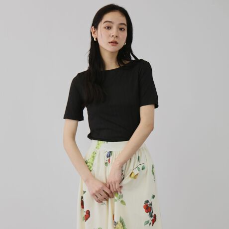 カジュアル見えしやすいテレコ素材も素材特有の微光沢感でクリーンな印象なので、フレアスカートやワイドパンツなどにあわせていただくとカジュアルながらもリッチ感の添えられるルックに仕上がります。