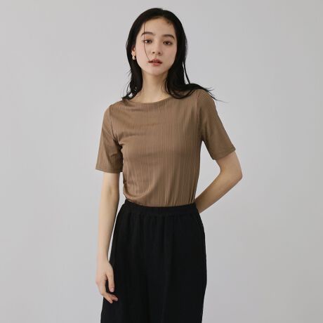 カジュアル見えしやすいテレコ素材も素材特有の微光沢感でクリーンな印象なので、フレアスカートやワイドパンツなどにあわせていただくとカジュアルながらもリッチ感の添えられるルックに仕上がります。