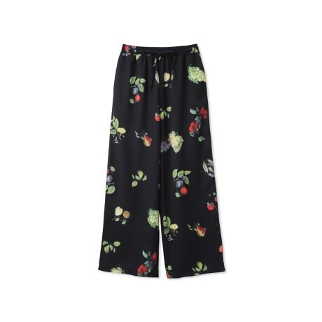 光沢感を程よく抑えたなめらかな肌ざわりのサテンのテキスタイルに、初夏の庭に広がる瑞々しいフルーツモチーフをプリントしたプルオンタイプのイージーワイドパンツです。