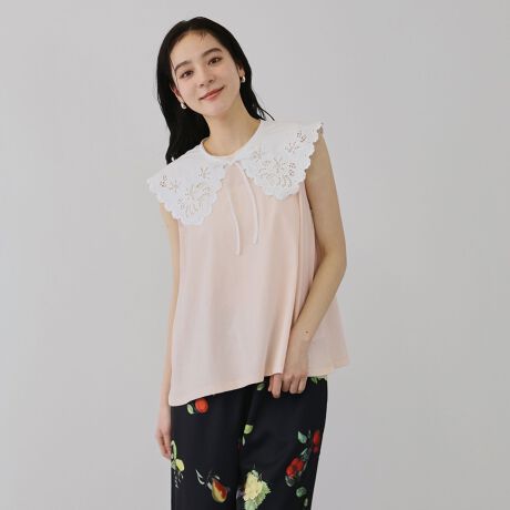 ボディラインに寄り添いながら程よくゆとりを持たせたノースリーブプルオーバーとイノセントな印象のスカラップレースのつけ襟の2ピースアイテムです。