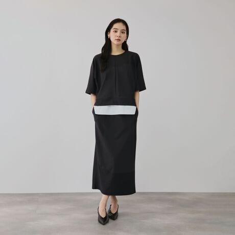 ラウンドヘムインナーをレイヤードしたようなゆったりシルエットの6分袖のドルマンプルオーバーとIラインスカートの2ピースセットアイテムです。