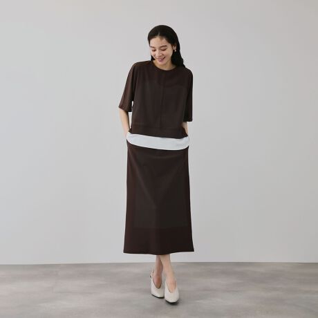 ラウンドヘムインナーをレイヤードしたようなゆったりシルエットの6分袖のドルマンプルオーバーとIラインスカートの2ピースセットアイテムです。