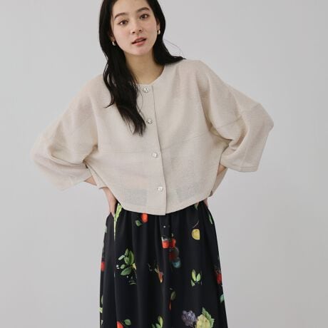 細やかなラメが織り込まれたメッシュ素材のコクーンフォルムのノーカラージャケットです。