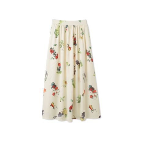 光沢感を程よく抑えたなめらかな肌ざわりのサテンのテキスタイルに、初夏の庭に広がる瑞々しいフルーツモチーフをプリントしたプルオンタイプのフレアスカートです。