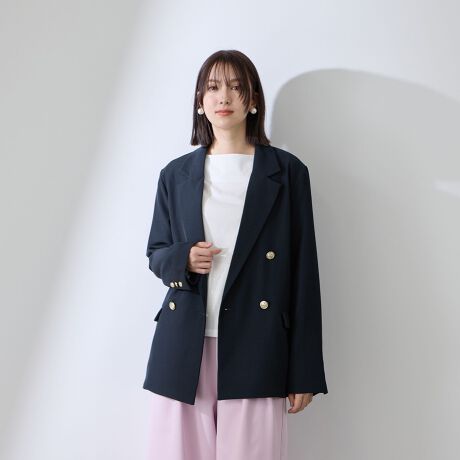 オーセンティックなダブルブレストのテーラードジャケットはエンブレムデザインのようなメタルカラーボタンでリッチ感をプラス。