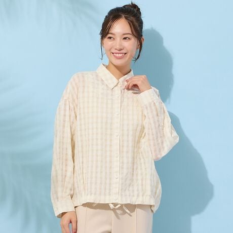 ポコポコと表面に凹凸がある、清涼感のある素材を使用したブルゾンタイプのブラウス。