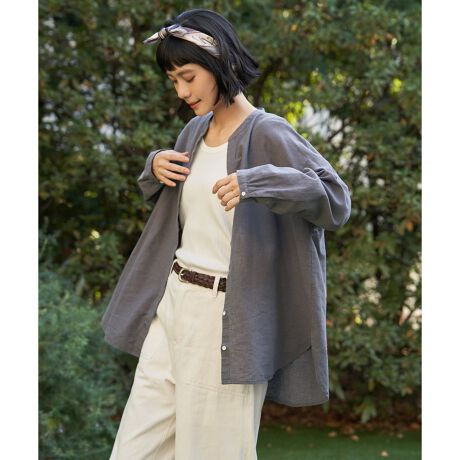 リネンコットン混素材でさらりとした肌触りのバンドカラーシャツ。