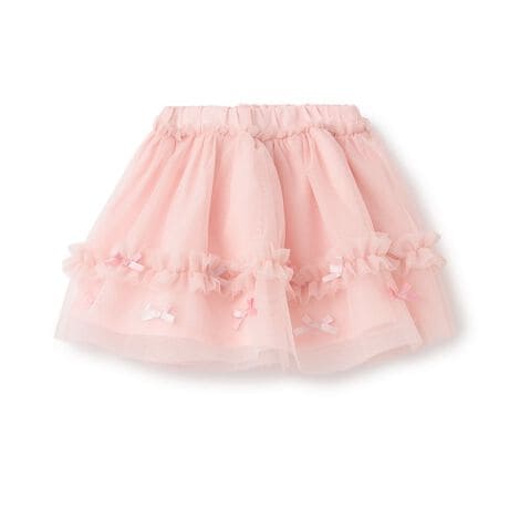 チュールをたっぷり使用した女の子らしいスカートです。同色のリボンをあしらい可愛い印象をプラス。動くたびにやさしく揺れるシルエットが上品な雰囲気を演出します。レギンスと合わせて長い期間着用できるのもうれしいポイントです。【おすすめの着用時期は春夏シーズン】