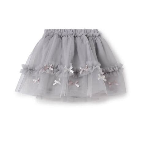 チュールをたっぷり使用した女の子らしいスカートです。同色のリボンをあしらい可愛い印象をプラス。動くたびにやさしく揺れるシルエットが上品な雰囲気を演出します。レギンスと合わせて長い期間着用できるのもうれしいポイントです。【おすすめの着用時期は春夏シーズン】