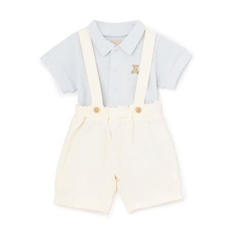 クラシカルなポロシャツ風のロンパースとサスペンダーつきパンツのセットです。左胸にほどこしたくまちゃんの刺しゅうで愛らしい雰囲気を演出。ロンパースの股下にはスナップボタンを備えており、スムーズなお着替えが叶います。落ち着いたカラーリングで日常着にはもちろん、特別なお出かけスタイルにもぴったりです。【おすすめの着用時期は春夏シーズン】