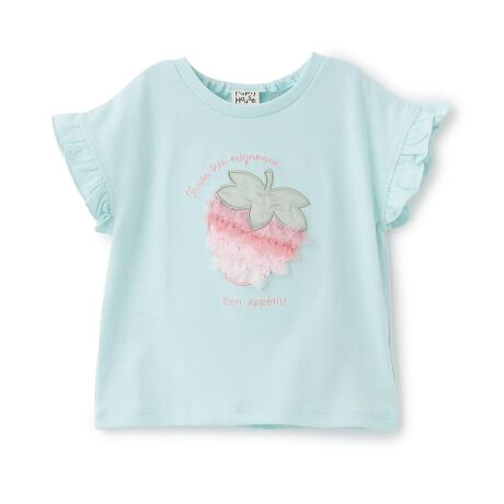 明るいベースカラーにフルーツのモチーフをプラスしたTシャツです。フロントに大きくあしらった立体的なアップリケが目を引く、とびきりキュートなデザイン。袖口のさりげないフリルで上品なシルエットに仕上げました。どんなボトムスとも好相性で、毎日のコーデ選びが楽しくなるような一着です。