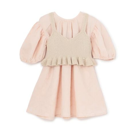 お姉さんっぽい雰囲気がただようワンピースとビスチェのセットです。同色のハートモチーフでさりげないアクセントをプラス。丸みのあるパフスリーブがかわいい印象を引き立てます。マシンウォッシャブル仕様なので、簡単にお洗濯できるのもうれしいポイント。重ねての着用はもちろん、それぞれ単体でコーディネートを組むのもおすすめです。内側にお名前を記入できるタグつき。【おすすめの着用時期は春夏シーズン】