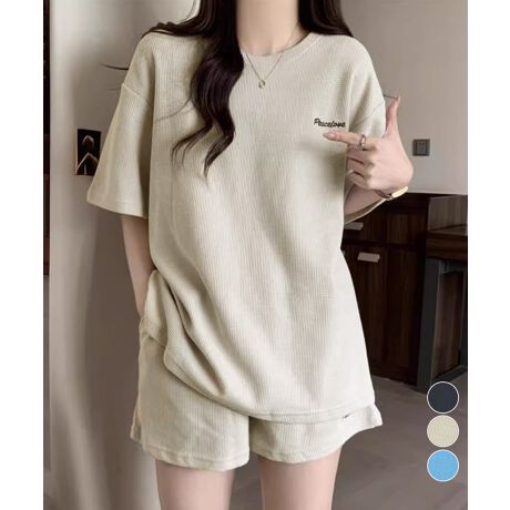 ルーズフィットシルエットにシンプルなロゴ刺繍が映える、ワッフル素材の半袖Tシャツとショーパンの上下セット。