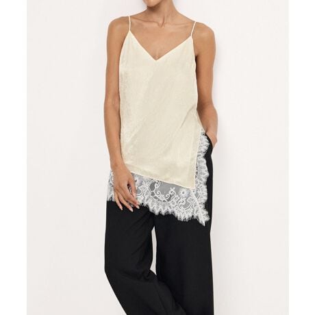 上品な微光沢のサテン調素材に、アシンメトリーレースをあしらったVネック細ストラップキャミソール。