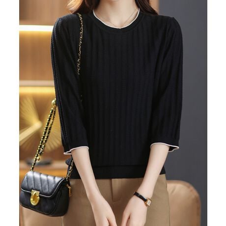 マルチリブ編みがおしゃれ、クルーネックデザインの七分袖ニットトップス。