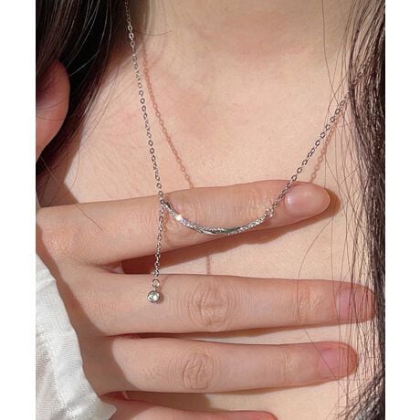 華奢なチェーンとさりげなく揺れるストーンが縦ラインを強調し、首元をすっきり上品に見せる。