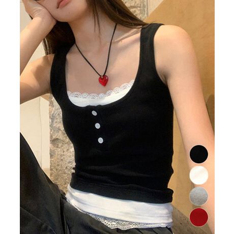 レースインナーを重ねたように見える、配色レイヤード風デザインのタンクトップ。