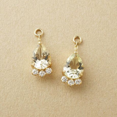 シズクの形のヘリオドールとモアサナイトを3石あしらいました。ヘリオドールは、淡い黄色〜黄緑色で透明度が高く透き通る輝きが魅力的です。
