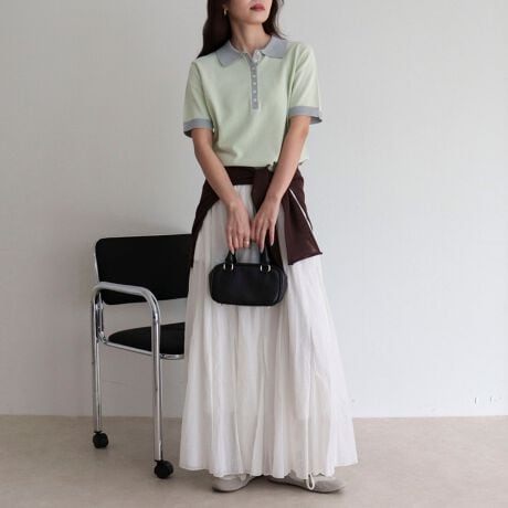 ・配色デザインが目を惹く、ポロ衿付き半袖ニットプルオーバー