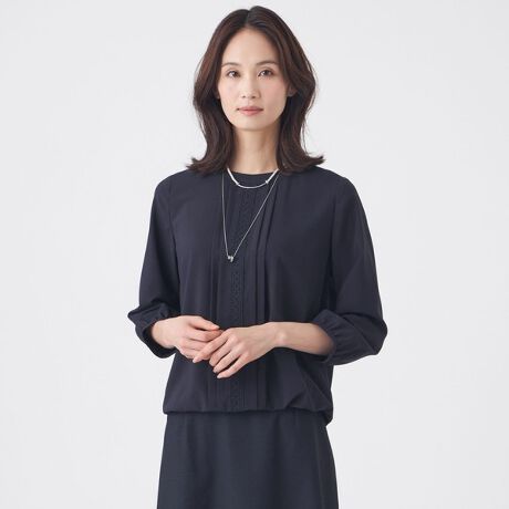 レースと細かなタックをあしらい、1枚で華やかさが引き立つブラウスです。