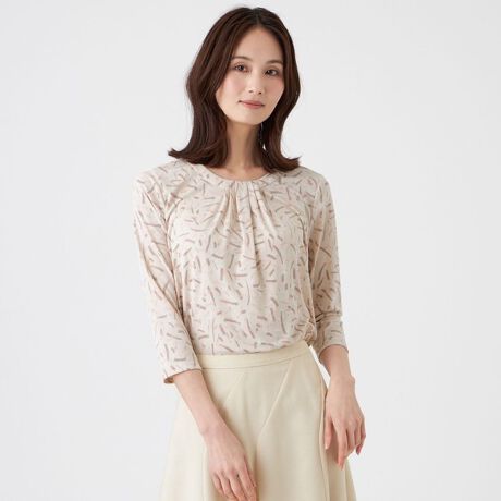 首まわりをすっきり見せるタックデザインで、一枚着としてもジャケットインとしても使いやすい仕様です。