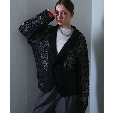 透かし編みの総柄デザインが新鮮なテーラードジャケット。
