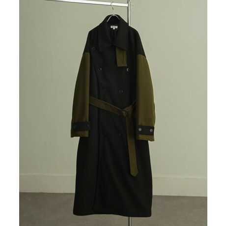 随所のバイカラー使いが特徴的なトレンチコート。