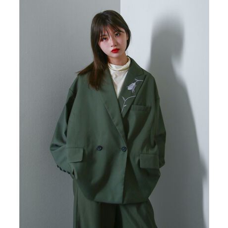 配色ステッチダブルテーラードジャケット。