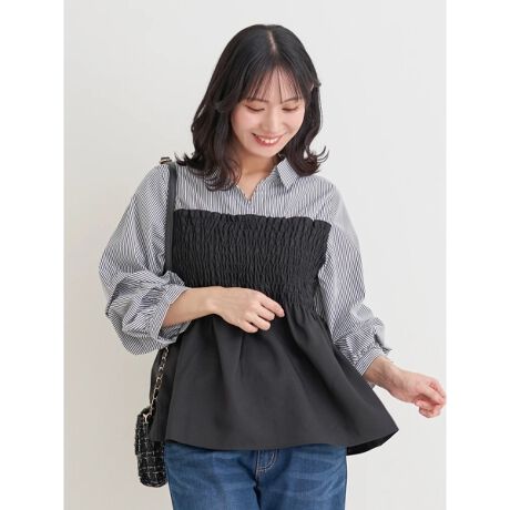 シャツにビスチェをレイヤードしたようなドッキングデザインのトップス。