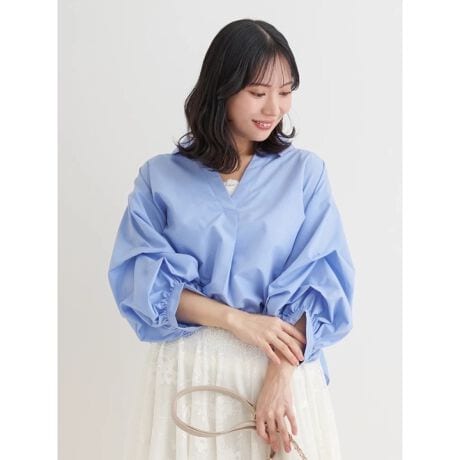 デザイン性の高いボリュームスリーブのスキッパーシャツ。