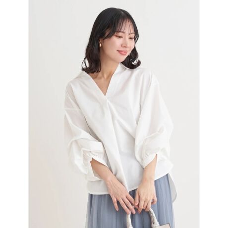 デザイン性の高いボリュームスリーブのスキッパーシャツ。