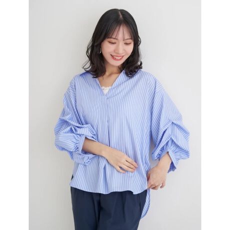 ストライプ柄が爽やかなデザイン性の高いボリュームスリーブのスキッパーシャツ。
