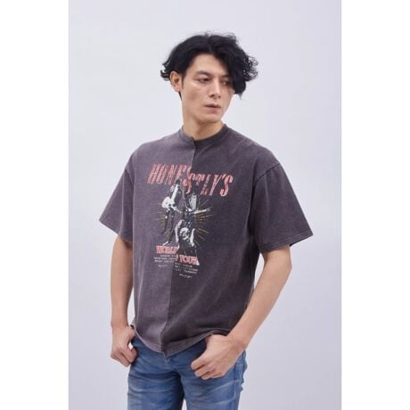 1969年、伝説の「ウッドストック・フェスティバル」をテーマに掲げた今季のコレクション。 架空のロックバンドをイメージしたグラフィックを、あえて一度解体し、左右で段違いに繋ぎ合わせたリメイク風の仕上がりが目を引きます。