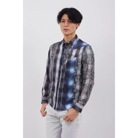 三種の下生地に、それぞれ異なる三種のオンブレチェック柄を重ね、パッチワークで再構成したチェックシャツです。