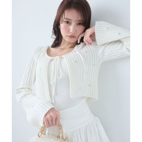 カーディガン全体に小花柄の刺繍とパールを散りばめ、ロマンティックで可愛らしい印象に仕上げました。