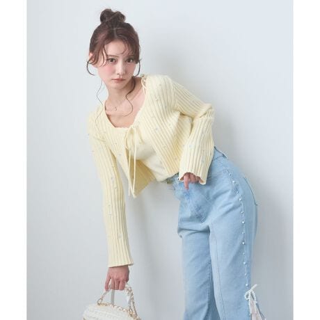 カーディガン全体に小花柄の刺繍とパールを散りばめ、ロマンティックで可愛らしい印象に仕上げました。