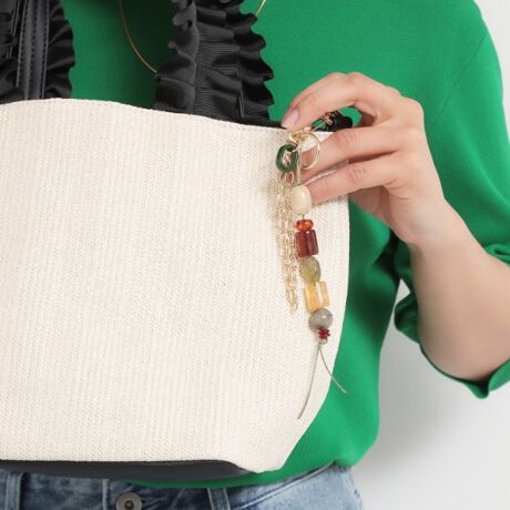 軽量ビーズ×コードの組み合わせで重すぎず、バッグのハンドルや金具に簡単に着脱できるフック式。