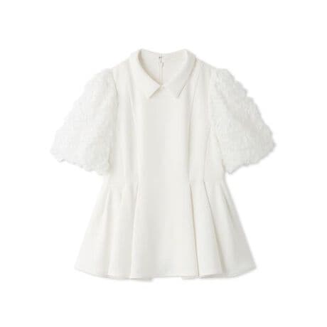 お花の様な立体感のある素材に仕上げた刺繍生地をCELFORDらしいパフスリーブと衿付きペプラムシルエットに落とし込んで春らしい華やかなブラウスに。