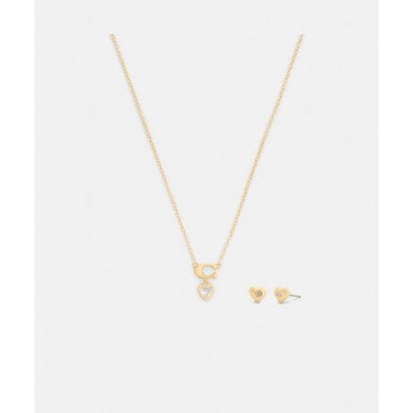 ハートのアクセントが愛らしい、ジュエリーセット。中心にクリスタルをあしらったハートのスタッド ピアスと、コーチの“C”とクリスタルが煌めくハートのペンダントをあしらった繊細なチェーン ネックレスを合わせました。