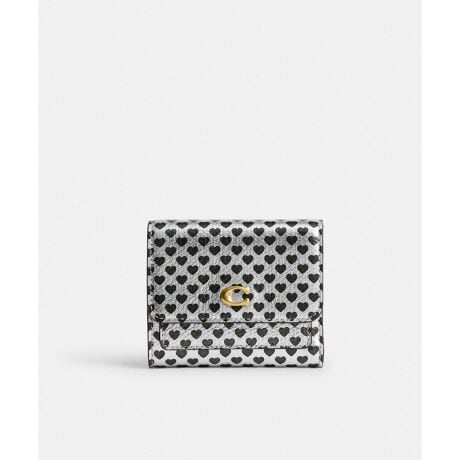 艶やかな光沢のあるフォイル メタリック レザーに、キュートなハートのプリントを施しました。コーチの“C”のハードウェアがアクセントを添えます。