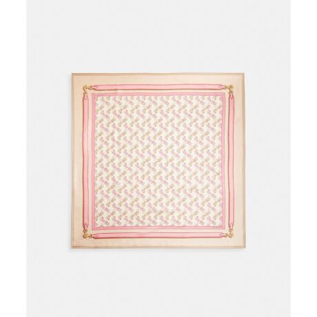 ソフトな質感のシルクのスクエア スカーフ。コーチのアイコニックなホース アンド キャリッジのモチーフの周りにバッグのレザーストラップ柄で縁を施したプリントが目を引きます。コーチのクラシックなスタイルを象徴するデザインです。