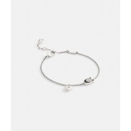 エナメルのスカルプテッド“C”と、中心にクリスタルのアクセントを添えたハートのペンダントをあしらった、繊細なチェーン ブレスレット。