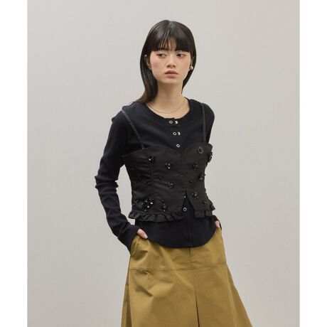 ビスチェはラフなベース生地に、華やかなフラワーモチーフの刺繍を施しフェミニンなエッセンスをプラス。